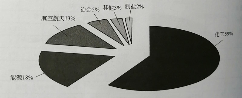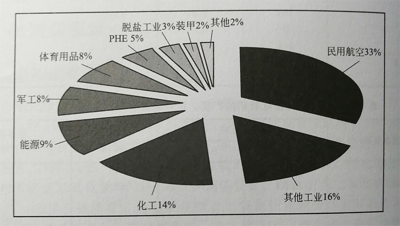 鈦合金的應用領域廣泛。圖1-2顯示了20世紀北美、西歐鈦在各領域的使用量,其中民用航空領域鈦的使用量 最大,占33%,其次為化工、能源、軍工和體育用品,少量的部分用于PHE、脫鹽工業(yè)和裝甲等。