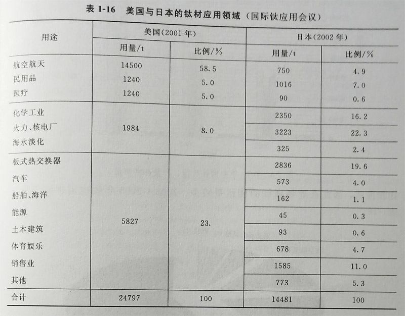 美國與日本的鈦加工材用途比較見表1-16,數(shù)據(jù)來源于上海國際鈦會議(從表1-16中可看出美國2001年鈦加工 材用量為24979t,其中宇航用量為14500t,占58.5%,這說明美國以航空工業(yè)為主。日本2002年鈦加工材用量為 14481t,其中宇航用量為705t,只占4.9%,日本是以民用工業(yè)為主。俄羅斯2000年宇航應用為45%~48%,船舶應 用為7%~12%,石油、化工和其他工業(yè)應用為12%~18%,出口為20%~30%,說明俄羅斯以宇航和船舶工業(yè)為主 出口量也較大近5年來,中國鈦材產(chǎn)量見表117(根據(jù)中國鈦協(xié)會統(tǒng)計),2001年為4720:;2002年為5482t;200年 為7080t;2004年為9292t;2005年為10136t鈦材產(chǎn)量增加近一倍(近10000,日前已成為繼美國、俄羅斯、日本 之后,躋 身世界第四大鈦工業(yè)國。