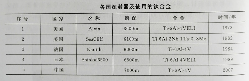 列出了各國發展的深潛器及使用的鈦合金