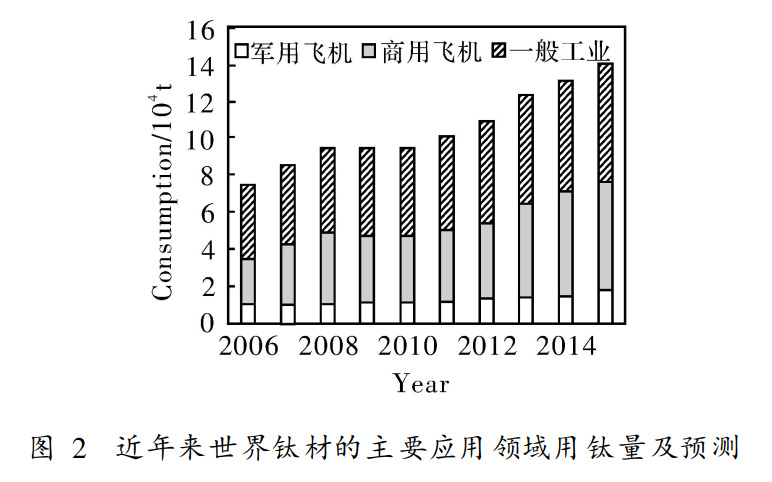 空客公司的A320飛機(jī)自1985年到2005年生產(chǎn)量達(dá)到4500架。每架空客A320用鈦量為13t。波音公司的B737飛機(jī)生產(chǎn)量自1968年到2005年達(dá)到6500架,每架波音B737用鈦量為18t。未來一代的空客A320波音B737窄體型飛機(jī)將采用先進(jìn)技術(shù)制造,意味著飛機(jī)機(jī)身有更多的部件使用鈦材,其中用鈦量較大的是起落架和發(fā)動機(jī)吊艙,預(yù)計每年鈦材額外用量將達(dá)到1500~6000.圖1示出世界主要商用飛機(jī)單機(jī)的用鈦量。圖2示出近年來世界鈦材在軍用飛機(jī)、民用飛機(jī)及一般工業(yè)領(lǐng)域的用鈦量及預(yù)測。
