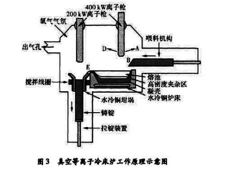 真空等離子冷爐床熔煉工藝是利用等離子槍發(fā)射的集中、穩(wěn)定、且可控的等離子弧作為熱源來(lái)熔融、精煉和重熔金屬的一種新型熔煉方法。等離子弧與自由電弧不同,它是一種壓縮弧,能量集中,弧柱細(xì)長(zhǎng)。與自由電弧相比,等離子弧具有較好的穩(wěn)定性、較大的長(zhǎng)度和較廣的掃描能力,從面使它在鈦及鈦合金熔煉、鑄造領(lǐng)域中具備了特有的優(yōu)勢(shì)。