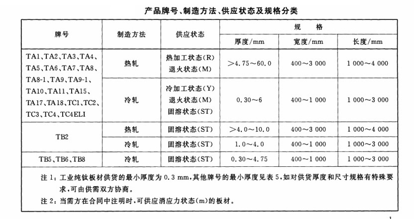 鈦板執行標準有兩類,國標是GB/T3621-2007、GB/T13810-2007,美標是ASTM B265、ASTM F136、ASTM F67、AMS4928。針對鈦合金板的GB/T3621-2007標準,從板材的要求、試驗方法、檢驗規則及標志、包裝、運輸、貯存及合同內容等方面,進行了詳細的規范,以下主要分享鈦合金板(GB/T3621-2007)的牌號、制造方法、供應狀態及規格等。