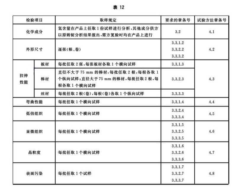5.4.2 拉伸性能、彎曲性能、顯微組織、晶粒度和表面污染檢驗中,如果有一個試樣的檢驗結(jié)果不合格,則從該批產(chǎn)品上取雙倍數(shù)量的試樣進(jìn)行該不合格項的重復(fù)檢驗。若重復(fù)檢驗仍有一個試樣不合格,判該批產(chǎn)品不合格。但允許供方逐張(根、卷)對不合格項進(jìn)行檢驗,合格者重新組批。