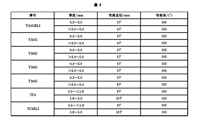 厚度不大于5.0mm的板材應(yīng)進(jìn)行彎曲試驗,彎曲直徑和彎曲角應(yīng)符合表4的規(guī)定。彎曲后彎曲部位應(yīng)無裂紋。