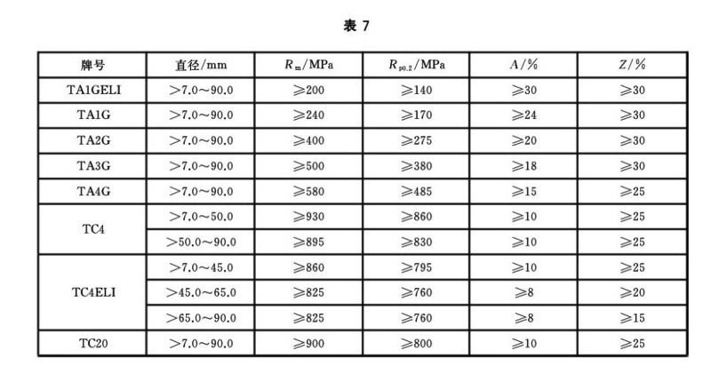 棒材的室溫拉伸性能應(yīng)符合表7的規(guī)定。
