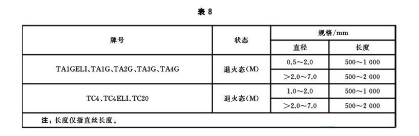 絲材的牌號、狀態(tài)及規(guī)格應(yīng)符合表8的規(guī)定。絲材通常按直絲供貨,需方要求并在合同中注明時,可按盤狀或卷裝供貨。