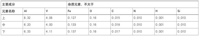 主要成分 雜質元素,不大于元素名稱 Al V Fe O C N H Si上6.32 4.06 0.127 0.16 0.015 0.010 0.001 0.010中6.20 4.00 0.133 0.16 0.018 0.010 0.001 0.010下6.33 4.11 0.137 0.16 0.017 0.010 0.001 0.010