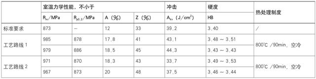 室溫力學性能,不小于 沖擊 硬度熱處理制度Rm/MPa Rp0.2/MPa A(%) Z(%) Akv(J/cm2) HB標準要求 873 - 12 33 39.2 3.40 /985 878 17.8 41 43.1 3.48~3.51工藝路線1 800℃ /90min,空冷979 886 18.5 45 44.3 3.43~3.43 971 870 18.3 43 33.7 3.49~3.53工藝路線2 800℃ /90min,空冷967 873 20 48 37.5 3.46~3.44