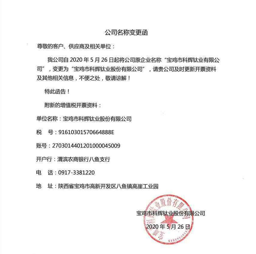 我公司自2020年5月26日起將公司原企業(yè)名稱“寶雞市科輝鈦業(yè)有限公司”,變更為“寶雞市科輝鈦業(yè)股份有限公司”,請貴公司及時(shí)更新開票資料及其他相關(guān)信息,不便之處,敬請諒解!