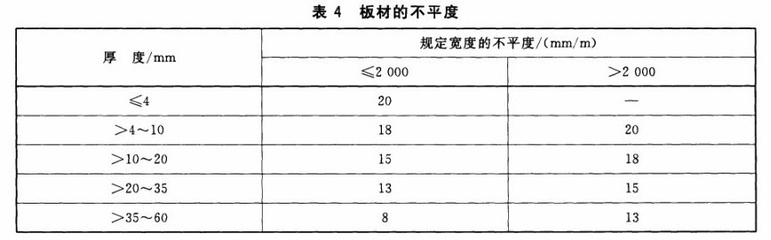 3.3.2 TB6板材允許有輕微板面皺浪,厚座≤5mm時,其不平度不大于50mm/m;厚度≤4mm的TB5、TB8和TB2板材的不平度不大于30mm/m;超出以上厚度時,雙方協商。其他牌號板材的不平度應符合表4的規定。