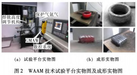 WAAM主要包括熔化極惰性氣體保護焊(Metalinert gas welding,MIG)、鎢極惰性氣體保護焊(Tung—sten inert gas welding,TIG)、等離子弧(Plasma arc,PA)、冷金屬過渡(Cold metal transfer,CMT)技術(shù)四種方式,TIG電弧增材制造技術(shù)是在鎢極氬弧焊接方法的基礎(chǔ)上改良而形成的一種技術(shù),主要的研究對象有鋁合金、鈦合金、不銹鋼;MIG電弧增材制造技術(shù)主要采用直接熔絲的方法進行堆焊,此項技術(shù)大多數(shù)主要研究其成形工藝和力學性能,主要研究對象有鋁合金、鈦合金;PA電弧增材制造技術(shù)是一種高效率的焊接熱源;CMT技術(shù)則是一種全新的冷金屬過渡技術(shù),其優(yōu)點為熱輸入低,可以避免熔滴穿透,有利于熔滴過渡和良好的冶金連接。圖2為華中科技大學電弧增材制造技術(shù)的試驗平臺實物圖及成形實物圖。