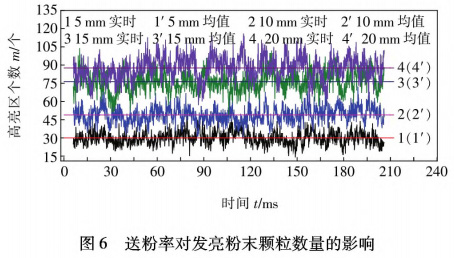 楊義成等人舊引以同軸送粉過程中粉末顆粒和激光發(fā)生相互作用過程為研究對象借助高分辨率攝像機,結(jié)合圖像二值化處理方法,分析不同工藝參數(shù)該過程的影響規(guī)律如圖6所示,得出結(jié)論:隨著激光功率增加、送粉速率提高,粉末顆粒被激光輻照的面積和數(shù)量均呈逐漸增加趨勢。而離焦量提高、載氣流量增加則會使激光輻照總面積逐漸降低。