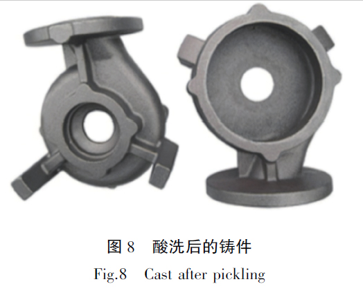 對于重量大或壁厚較厚的鑄件通常表面污染層較厚就需要采取酸洗工藝去除污染層。本工藝采用聚合硫酸鐵和氫佛酸的混合酸進行酸洗,徹底去除污染層后,用清水進行沖洗。整個酸洗過程要求嚴格控制酸洗溫度和酸洗量,保證完全去除污染層。此酸洗液相比于硝酸和氫氟酸的混合酸洗液酸洗速度更快,酸洗效果更好。新型酸洗液配比為,聚合硫酸鐵(含 鐵≥19%)重量比為22.9,水重量比為69,氫氟酸重量比為8.1。圖8 為酸洗后的鑄件。
