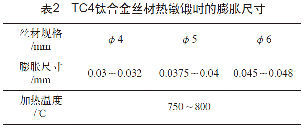 原材料在成形時的變形量對其性能存在顯著影響,有研究表明[2],TC4鈦合金的性能隨著變形量由0.44mm變到0.96mm,其屈服強度可由897MPa提高到1043MPa,抗拉強度也相應地由1069MPa增加到1290MPa,而且當變形量在0.44~0.86mm時,屈服強度和抗拉強度變化速率都較慢,當變形量超過0.86mm時,絲材強度急劇上升,表現為快速強化過程,進一步分析認為,絲材強度急劇上升與變形機制有關。隨變形量的增大,絲材塑性逐漸下降,表現為伸長率減小。當變形量在0.44~0.86mm時,絲材塑性較好,伸長率>15%,而當變形量>0.86mm時,絲材塑性突降,伸長率不超過10%,即變形量0.86mm是整個變化過程的拐點(此處變形量指的是材料在拉拔時的變形量)。由此可以推斷,原材料在成形時的變形量,會顯著影響材料的強度和塑性,從而在一定程度上會影響鐓鍛成形的效果。
