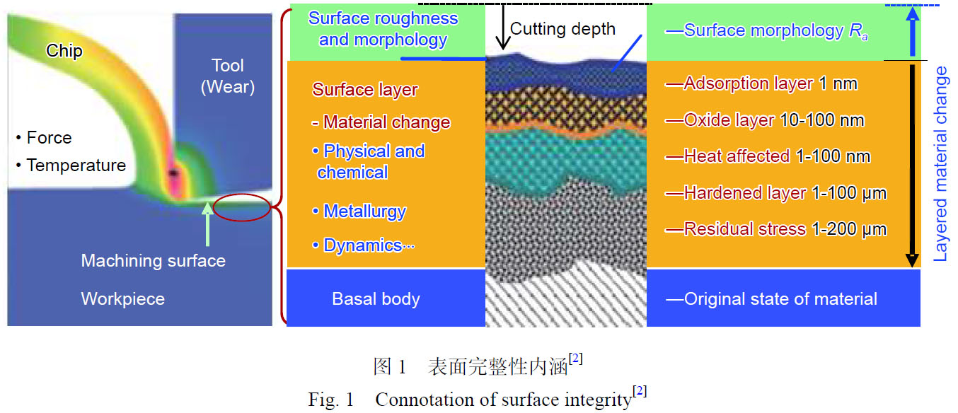 航空發(fā)動機作為飛機的心臟,直接影響著飛機的性能、可靠性和經濟性,是一個國家科技、工業(yè)和國防實力的重要體現(xiàn)。現(xiàn)有航空發(fā)動機多采用高強度合金作為其主體結構和主承力構件,其服役能力的強弱取決于加工質量。表面完整性已經發(fā)展為描述、評價和控制零件加工過程在其加工表面和表層內可能產生的各種表面狀態(tài)變化及其對該表面工作性能影響的技術指標[1]。表面完整性是制造加工過程中構件表面和表層材料可能產生的各種改變及其對構件服役性能影響的總體描述和控制,主要包含表面形貌變化和表層材質變化(如圖1所示[2])。表面形貌變化主要包括表面粗糙度、表面形貌/紋理、刀紋方向和裂紋、劃傷、雜質等宏觀缺陷;表層材質變化特征主要包括顯微結構變化、再結晶、晶間腐蝕、熱影響區(qū)、顯微裂紋、硬度變化、塑性變形、殘余應力等[3]。粗糙表面或機械加工引起的刀痕、缺陷等因素會引起很高的表面應力集中,造成工作載荷應力峰值高,直接成為疲勞源;潛伏在亞表層的微結構和微力學的損傷缺陷將急劇加速疲勞裂紋的萌生和擴展,加速疲勞失效;殘余壓應力可以抑制疲勞裂紋的萌生而延長疲勞壽命;提高表面顯微硬度值亦會抑制疲勞裂紋的萌生,但是會加速疲勞裂紋的擴展?梢姡趬勖饕蕾囉跉堄鄳捅韺游⒂^結構,殘余應力松弛嚴重時表層組織晶粒細化對疲勞壽命影響占主導。