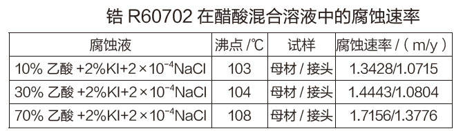 左小濤等采用電化學方法研究了Zr702 惰性氣體保護焊焊接接頭在5mol/L、10mol/L 和純醋酸介質中的腐蝕行為,分析了其極化曲線。此外,還使用掃描電子顯微鏡觀察腐蝕 形貌。結果表明,在不同濃度的醋酸介質中,抗腐蝕性能自母材,焊縫到熱影響區依次下降;隨著醋酸濃度的提高,母材、焊縫及熱影響區的自腐蝕電位差不斷減小,耐點蝕能力增強。