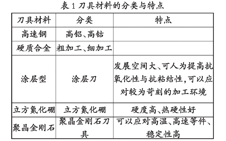 在鈦合金材料機(jī)械加工工藝中,刀具的性能宜接 決定著機(jī)械加工的效率與質(zhì)量。由于鈦合金材料具有 導(dǎo)熱性差、可塑性不高、硬度較高等特點(diǎn),并且鈦合金 材料的機(jī)械加工環(huán)境具有高溫、高壓等特點(diǎn),因此刀具 材料的選擇非常重要。一般情況下,加工企業(yè)為了控制 成本,減少刀具的磨損程度,往往會(huì)選擇一些具有高耐 磨性、高硬度的刀具,如表1所示。