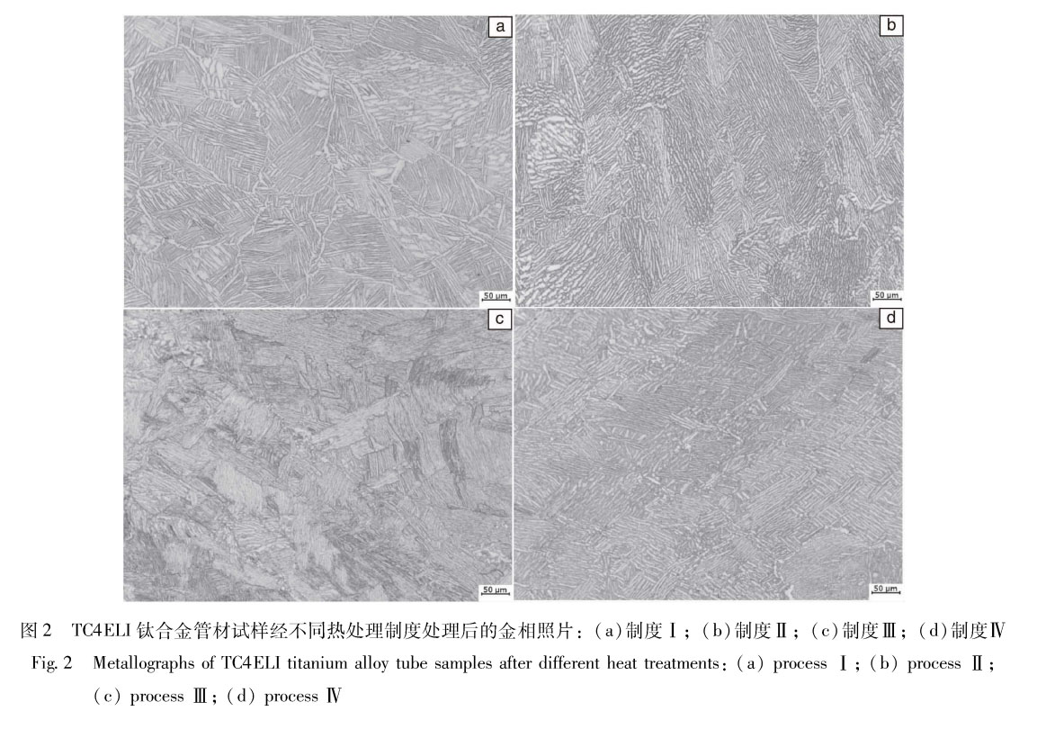 實驗用管材通過斜軋穿孔工藝制備#其熱加工工作溫度超過相變點,導致晶粒長大,隨后可進行熱處理改善管材性能,但因為沒有大的變形量,導致管坯組織形態不易發生改變,試樣在4 種熱處理制度處理后獲得的組織均為魏氏組織。而常規TC4ELI鈦合金產品,制備過程工藝可控,比如通過調整鍛造溫度、變形量控制合金半成品時的組織形態,后續通過熱處理改變其組織形態,進而獲得優異的力學性能。前期作者團隊對TC4-DT 鈦合金鍛件進行熱處理[8 ],鍛件原始組織形態為雙態組織,經普通退火后雙態組織中等軸組織比例減小、片層組織比例增多;區退火,獲得魏氏組織;α+β兩相區固溶后時效,獲得均勻細小等軸組織(單相區固溶后時效,獲得魏氏組織。因而常規TC4-DT產品熱處理制度較為寬泛,組織形態可調。