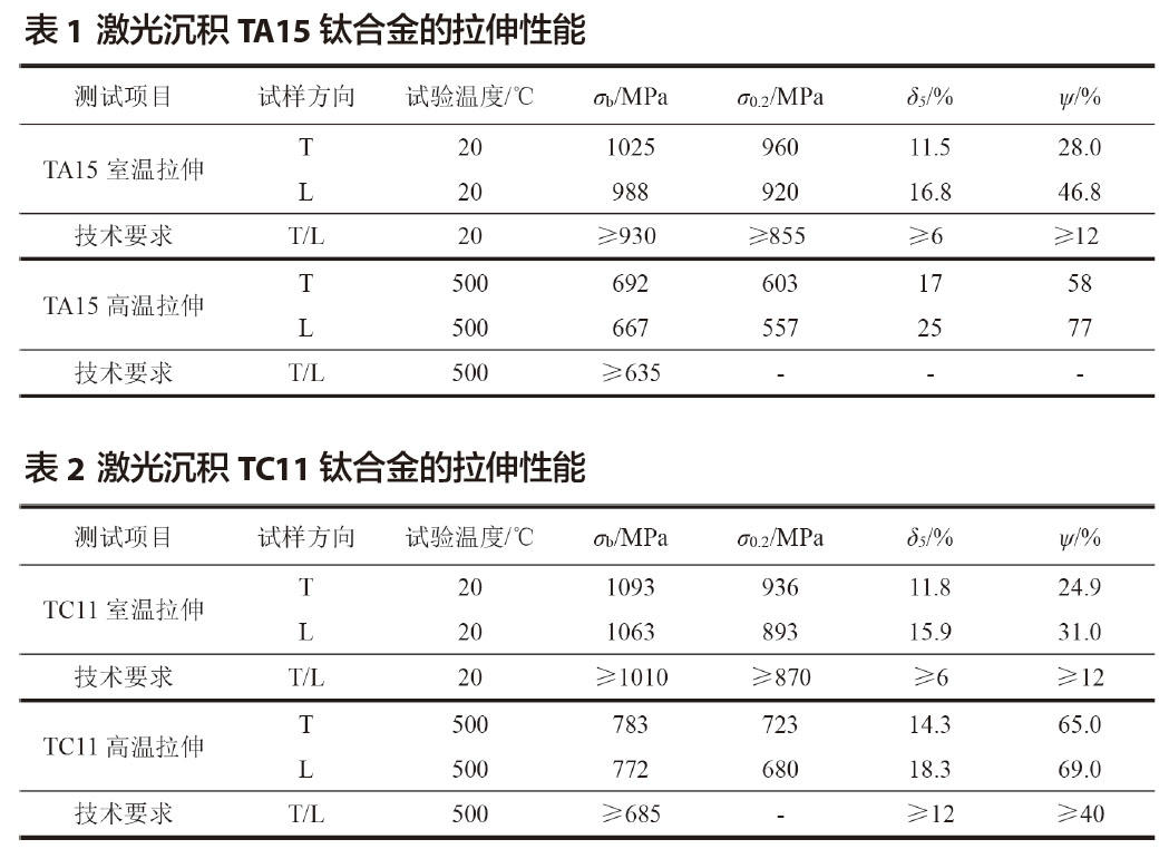 2、TA15鈦合金名義成分為 Ti-6.5Al-2Zr-1Mo-1V,對應俄羅斯牌號為 BT20,屬于高 Al 當量的近 α 型鈦合金,既具有 α 型鈦合金良好的熱強性和可焊性,又具有接近于 α+β 型鈦合金的工藝塑性,是一種具有中等強度兼具良好熱穩定性和焊接性能良好的鈦合金,比 TC4鈦合金有更高的室溫、高溫強度和更優異的焊接性能,長時間(3000 h)工作溫度可達 500 ℃,450℃下工作時,壽命可達 6000 h,瞬時(不超過 5 min)工作溫度可達 800 ℃。主要應用在發動機的各種葉片、機匣,飛機的各種鈑金件、梁、接頭、大型壁板和焊接承力框等,采用激光沉積增材制造技術制備的 TA15 材料的拉伸性能數據見表 1。