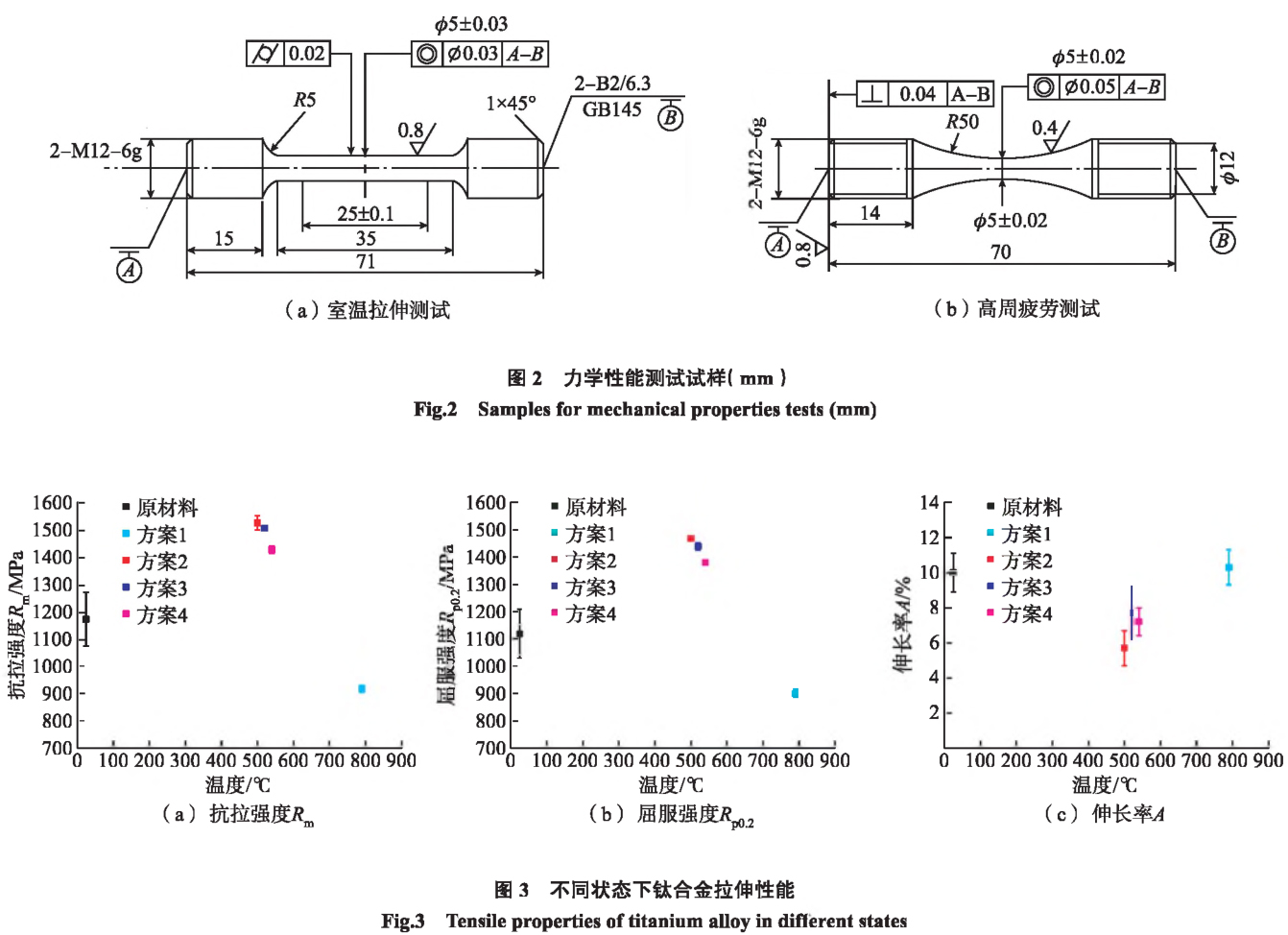 依據GB/T 228.1-2010《金屬材料拉伸試驗第1部分:室溫試驗方法》開展室溫拉伸測試,同種狀態的試樣各進行3次拉伸試驗,然后求取平均值;依據GB/T 3075-2008《金屬材料疲勞試驗軸向力控制方法》開展室溫、空氣環境下的軸向高周疲勞試驗,加載頻率為100 Hz,應力比為R=0.1,最大應力水平介于700~1100 MPa之間,疲勞壽命超出1 x 107時則終止試驗。采用升降法計算存活率為50%條件下的中值疲勞極限。本研究所采用的力學性能試樣如圖2所示。