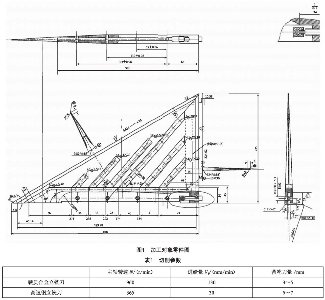 鈦合金材料作為一種輕合金材料,在航空航天領域應用廣泛,具有比強度高、耐腐蝕、熱能力優秀等特點但鈦合金亦是一種典型的難加工材料,切削加工過程中切削溫度高、回彈大,極易發生加工硬化,對切削刀具與切削工藝均提出了極高的要求血。本文針對航空航天鈦合金結構件加工的工程問題,開展了切削刀具與切削工藝的研究,最終保證切削加工順利完成。