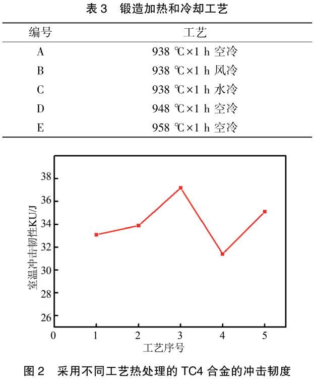 TC4(Ti-6Al-4V)合金屬于α+β型鈦合金,比強度高、耐蝕性好,被廣泛應用于航空、航天及船舶制造等領域[1-2]。不同工藝鍛造或熱處理的TC4鈦合金α和β相的數量、比例、形態和性能均有較大差異[3-4]。鍛造的TC4鈦合金葉片需進行熱處理以獲得所需的組織和性能。為確保力學性能符合要求,可通過熱處理控制α相的含量、尺寸和形態[5]。王曉燕等[6]通過熱處理來控制鈦合金中初生和次生α相的含量,改善材料的力學性能。沖擊性能是TC4鈦合金鍛件的重要質量指標,但對α相的含量及形態對鈦合金沖擊韌度的影響的研究較少。本文研究了鍛造溫度、鍛后冷卻速率和熱處理工藝對TC4鈦合金顯微組織和沖擊韌度的影響。