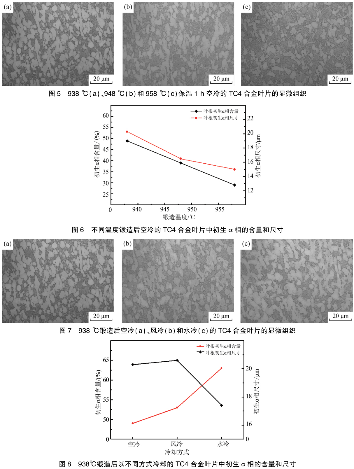 圖7為938℃鍛造隨后退火的TC4合金葉片的顯微組織,也是典型的雙相組織。鍛后以不同方式冷卻的葉片中初生α相含量及其平均直徑如圖8所示。這些結果表明,隨著鍛后冷卻速度的提高,葉片中初生α相平均直徑減小,水冷的葉片初生α相尺寸明顯小于風冷和空冷的葉片,且水冷的葉片初生α相被明顯拉長,說明鍛后冷卻速度對葉片初生α相的形態有較大影響,而對初生α相含量的影響不明顯。這是由于初生α相含量主要受溫度的影響。