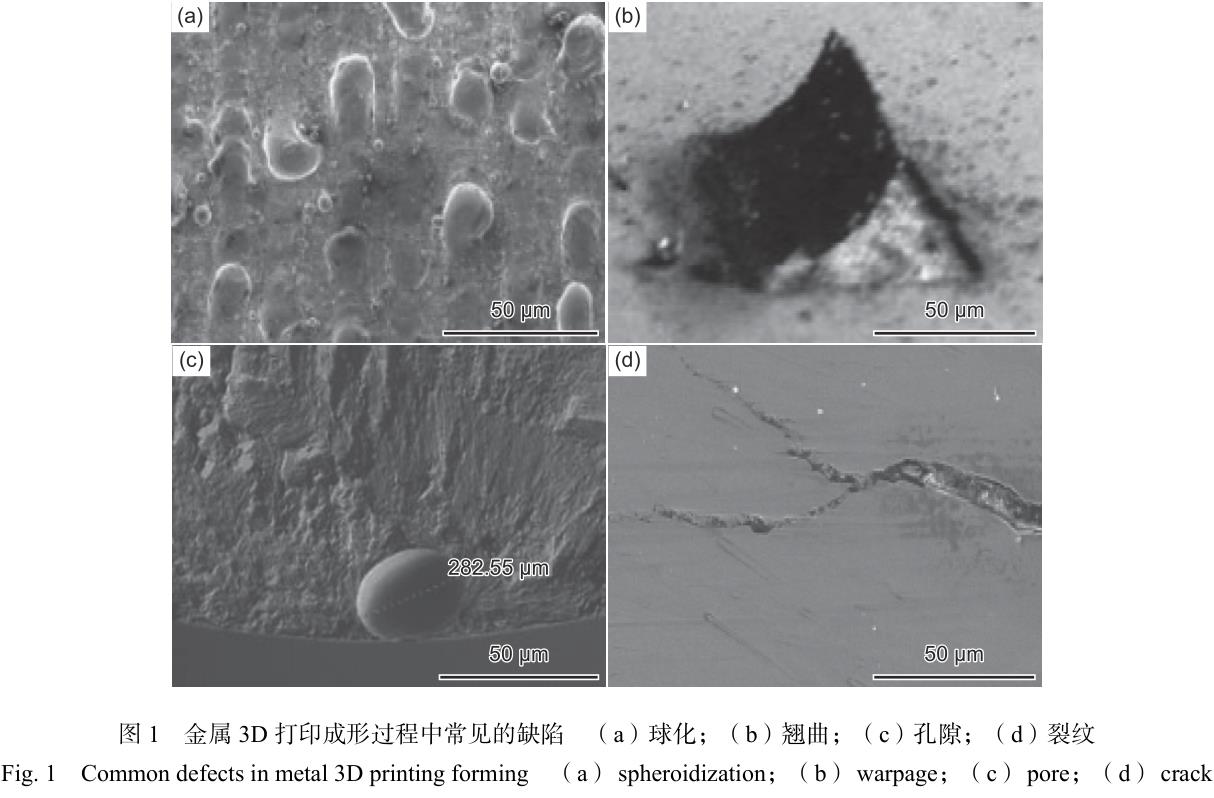 采用3D打印技術(shù)制備鈦合金,成功克服了使用傳統(tǒng)方法制備鈦合金結(jié)構(gòu)件時,所面臨的費用高、材料浪費嚴重、加工工藝復雜,以及后續(xù)加工困難等不利因素,但采用3D打印技術(shù)成形鈦合金零件時,由于粉末/絲材特殊的加工性能,或者工藝參數(shù)選擇不當,工件容易出現(xiàn)球化、裂紋、孔隙以及翹曲變形等缺陷。如圖 1 所示,嚴重影響鈦合金的機械性能和成形精度,阻礙了鈦合金3D打印技術(shù)的發(fā)展。另外,缺陷無損檢測是3D打印件能否實現(xiàn)廣泛應(yīng)用的基礎(chǔ),也是影響3D打印技術(shù)進一步發(fā)展的決定因素。目前,國內(nèi)外對3D打印件缺陷進行無損檢測的方法主要有[20-22]:滲透檢測、X 射線檢測、磁粉檢測和超聲檢測等。隨著3D打印件向結(jié)構(gòu)大型化、復雜化和精細化方向發(fā)展,傳統(tǒng)的無損檢測方法已經(jīng)不再適用于3D打印件的缺陷檢測和分析,新型的無損檢測技術(shù)工業(yè) CT 檢測和激光超聲在線無損檢測相繼問世。Plessis 等[23]采用 CT 技術(shù)檢測3D打印成形的復雜鈦合金結(jié)構(gòu)件,成功檢出了孔隙率僅為 0.005% 的微孔隙,這在采用常規(guī)無損檢測方法是幾乎不可能檢出的。國內(nèi)一專利[24]發(fā)明了激光超聲無損檢測技術(shù),利用激光激勵的超聲表面波幅的變化檢測3D打印過程中產(chǎn)生的缺陷,實現(xiàn)制造過程同步對零件進行檢測。