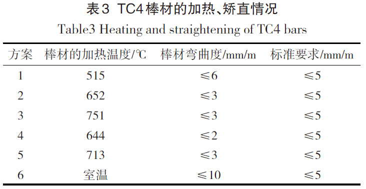 棒材的加熱溫度檢測(cè)采用手持式紅外測(cè)溫儀測(cè)量。每個(gè)方案中,隨機(jī)在同一批軋制的TC4鈦合金棒材中分別選擇10支棒材進(jìn)行矯直試驗(yàn)。