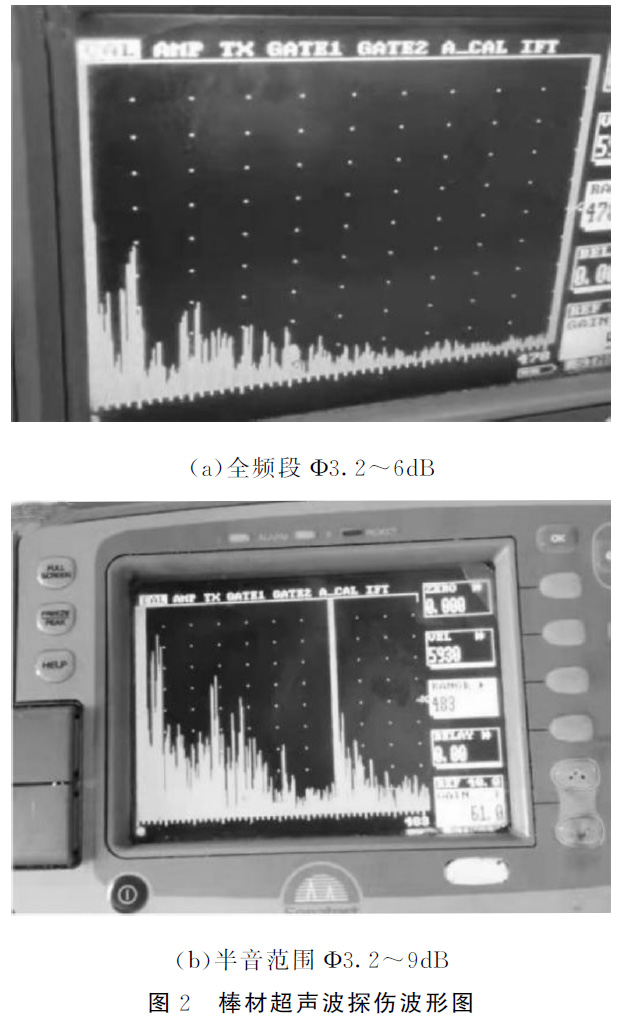 對鈦合金棒材進行探傷分析,圖2為超聲波探傷波形圖,表1為棒材超聲探傷結果,其中Δd為整支棒材的底波噪聲差異,可以發現,對于長度達2000mm的棒材來說,雜波能穩定達到GB5193GB級水平,說明棒材的內部組織均勻性較好。