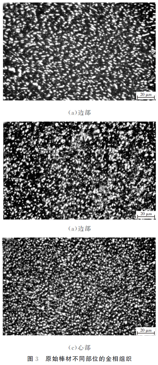 圖3為棒材邊部、R/2部以及心部的金相組織,由圖3可知,組織為大量初生α相均勻分布在基體上,其晶粒十分細小且均勻,α相形貌為等軸狀形態。同時,棒材心部晶粒較邊部略大,這是因為棒材規格較大,在鍛造加工過程中,其心部的溫度較邊部相比下降的較慢,導致心部溫度略高,在熱能的作用下,心部晶粒長大所致。棒材在塑性變形過程中,隨著不斷增加的變形量,原始鑄錠中粗大晶粒在外應力作用下,會產生變形甚至發生破碎,晶粒會順著棒材形變的方向被拉長,同時發生扭曲變形,其破碎的小晶粒會沿著形變方向進行排列。當棒材的變形量達到一定數值時,其內部會有帶狀組織形成,在隨后的塑性變形以及加熱過程中,組織內部會產生再結晶,最終形成等軸狀α小晶粒[11]。