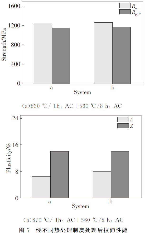圖5為合金經不同熱處理制度處理后的拉伸性能,可以發現,合金的強度與塑性均較高,具有良好的強塑性匹配,且隨著固溶溫度的升高,合金的強度與塑性均有所升高,但塑性升高的幅度較低,相比之下,合金經870℃/1h,AC+560℃/8h,AC處理后,其各項拉伸性能達到最佳值,為最佳熱處理制度,此時合金的抗拉強度(Rm)為1257MPa,屈服強度(Rp0.2)為1168MPa,斷后伸長率(A)為8%,斷面收縮率(Z)為14%。