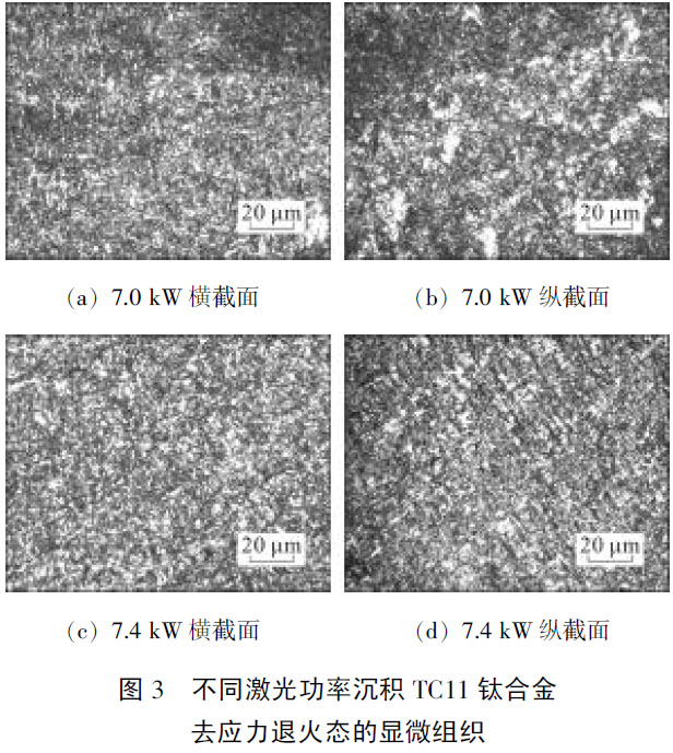 不同激光功率沉積并經去應力退火后所對應的TC11鈦合金不同截面部位的顯微組織如圖3 所示。