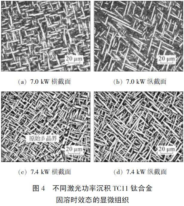 析出的α針交錯、細密,得到的網籃組織編織程度就高[7-8]。經過固溶時效后這種趨勢就變得更明顯。不同激光功率沉積,并經990℃保溫1h固溶,530℃保溫6h時效后TC11鈦合金的顯微組織如圖4 所示。
