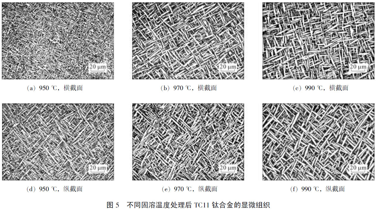 隨著固溶溫度的升高,針條狀α相發生了變化。在950℃進行固溶處理時,由于固溶溫度較低,時效后橫截面仍可觀察到少量塊狀α相在網籃之間分布,且橫截面和縱截面的組織差異較大,縱截面的針條狀初生αp相明顯長于橫截面,長度相差3~4倍,而且組織粗大發達,橫截面針條狀α相均勻細小。