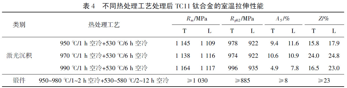 表4 列出了相同激光功率(7.4kW)沉積,不同固溶溫度處理,并經相同時效工藝處理后,所對應的激光沉積TC11鈦合金的室溫拉伸性能和TC11鈦合金鍛件的室溫拉伸性能要求。