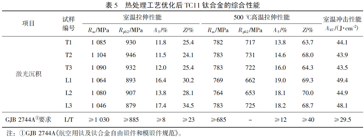 熱處理工藝經過優化后,激光沉積TC11鈦合金的綜合性能達到了GJB 2744A鍛件的技術要求。