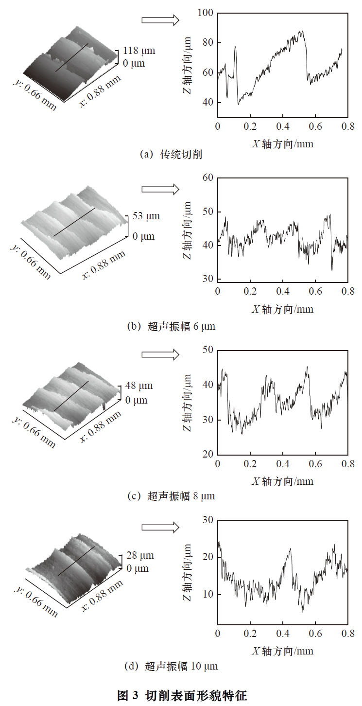 應(yīng)該說明的是,超聲切削與傳統(tǒng)切削在去除材料機(jī)理方面存在本質(zhì)不同,在切削過程中,切削刀具在超聲變幅桿的作用下,其運(yùn)動(dòng)軌跡為橢圓曲線,在切削試樣表面引起的劃痕和溝槽起到一定的光整作用,并降低了切削加工中的切削力和切削振動(dòng),提高了切削穩(wěn)定性[10]。相關(guān)研究證明了超聲切削時(shí)間相對(duì)于傳統(tǒng)切削加工較短,刀具與工件、切屑完全