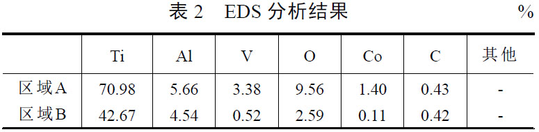 進(jìn)一步利用EDS 析對(duì)比了傳統(tǒng)切削和超聲切削加工后刀具能譜分成分,如表2 所示?梢钥吹,傳統(tǒng)切削的刀具區(qū)域A 的能譜中檢測(cè)到其表面覆蓋了大量的Ti 元素同時(shí)檢測(cè)到O 元素比例為9.56 %,說明了傳統(tǒng)切削刀具在加工TB9 鈦合金過程中伴隨著氧化磨損。由圖5a 刀具磨損形貌可以推測(cè)出傳統(tǒng)切削的磨損形式主要以磨粒磨損、粘結(jié)磨損和氧化磨損為主。在超聲切削刀具的能譜分析結(jié)果中,區(qū)域B 的EDS 分析結(jié)果表明了超聲切削刀具粘結(jié)區(qū)域中O 元素含量降低至2.59 %,這是由于超聲切削將連續(xù)的加工方式轉(zhuǎn)化為斷續(xù)切削加工[8,10,13],使刀具在切削中的溫度大幅度降低,有效地提高了刀具的使用壽命和試樣的加工質(zhì)量。結(jié)合圖5b~d 超聲刀具磨損形貌最終確定超聲切削刀具的磨損形式轉(zhuǎn)變?yōu)檩p微的磨粒磨損、粘結(jié)磨損和氧化磨損為主。