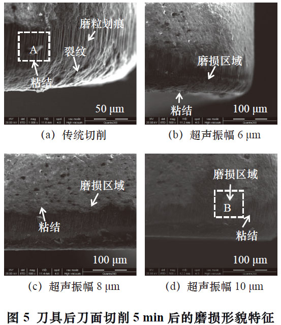 (3)超聲切削能夠降低切削中磨粒磨損,有效降低切削刀具中粘結(jié)區(qū)域的含氧量,刀具磨損形式主要表現(xiàn)為輕微的磨粒磨損、粘結(jié)磨損和氧化磨損損為主。