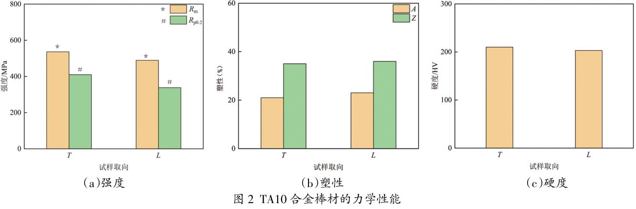 經(jīng)鍛造加工后的TA10合金棒材的力學(xué)性能如圖2所示。由圖2(a)可知,在棒材的拉伸性能方面,其抗拉強(qiáng) 度(Rm)和屈服強(qiáng)度(Rp0.2)均是T向較高,其中棒材T向的抗拉強(qiáng)度為536MPa,屈服強(qiáng)度為410MPa,棒材L 向的抗拉強(qiáng)度(Rm)為489MPa,屈服強(qiáng)度(Rp0.2)為338MPa。由圖2(b)可知,在塑性方面,其T向與L向 塑性性能接近,差異較小,其中棒材T向的斷后延伸率(A)為21%,斷面收縮率(Z)為35%,棒材L向的斷后 延伸率(A)為23%,斷面收縮率(Z)為36%。