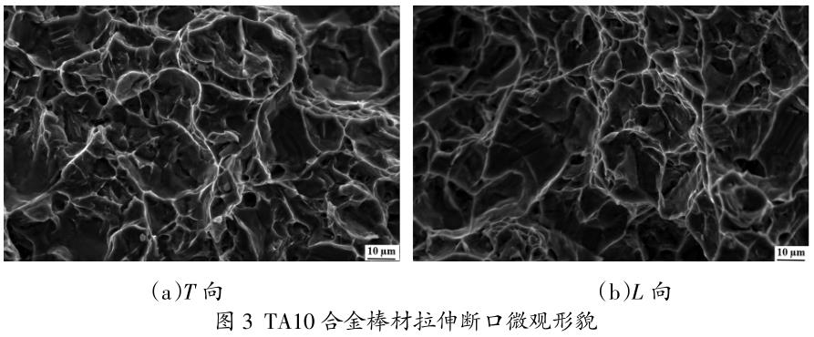 TA10合金棒材拉伸斷口微觀形貌如圖3所示。由圖3可知,棒材T向與L向拉伸斷口微觀形貌幾乎一致,均是以 等軸狀韌窩為主,其中韌窩形貌與數(shù)量是體現(xiàn)合金塑性大小的主要依據(jù),當(dāng)韌窩數(shù)量較多且深時(shí),棒材具有 較高的塑性值;當(dāng)韌性數(shù)量較少且淺時(shí),合金具有較低的塑性值。韌窩的產(chǎn)生是由于棒材進(jìn)行拉伸時(shí),較快 的應(yīng)變速率會(huì)使位錯(cuò)在滑移過程中產(chǎn)生應(yīng)力集中,導(dǎo)致組織中的微孔發(fā)生形核,在拉伸不斷進(jìn)行過程中,位 錯(cuò)運(yùn)動(dòng)受到的排斥力降低,微孔內(nèi)會(huì)有少量位錯(cuò)進(jìn)入,再次激活位錯(cuò)源,因?yàn)榘舨脑谒苄宰冃蔚倪^程中會(huì)不 斷形成新的位錯(cuò),導(dǎo)致微孔內(nèi)會(huì)連續(xù)不斷地進(jìn)入新形成的位錯(cuò),促使微孔生長,微孔不斷地匯聚在斷口處, 并且留下痕跡,最終形成韌窩[11]。在棒材的斷口微觀形貌中還發(fā)現(xiàn)少量的二次裂紋,這是因?yàn)榻M織中存在 β轉(zhuǎn)變組織,棒材在拉伸過程中,位錯(cuò)運(yùn)動(dòng)受到阻塞作用,導(dǎo)致位錯(cuò)的運(yùn)動(dòng)產(chǎn)生一定偏移所導(dǎo)致,同時(shí)在棒 材L向的斷口微觀形貌中有較為明顯的撕裂棱,撕裂棱的出現(xiàn)代表棒材的強(qiáng)度較大,這與棒材實(shí)際拉伸性能 一致[12]。