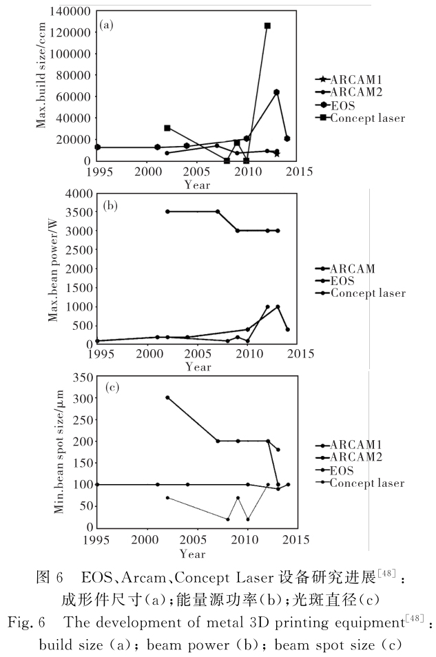 但是,SLM成形效率低、金屬粉末成本高昂是該工藝亟待解決的技術難點。SEBM設備能力介于LMD與SLM兩者之間,既有較好的表面質量,又有較高的成形效率,是目前醫療領域、航空領域的主要制備技術,如圖5所示。表5列出了不同3D打印設備的成形件尺寸和能量源功率,可以看到,SLM和SEBM的設備能量源功率和成形件尺寸均小于LMD設備,因此,LMD具備打印大型成形件的能力。圖6為近年來金屬粉末3D打印設備研發進展情況,可以看到高功率能量源的研發不再是設備的主要關注點,反而大尺寸成形件、高精度光斑、恒定能量源是未來3D打印設備的主要發展趨勢。