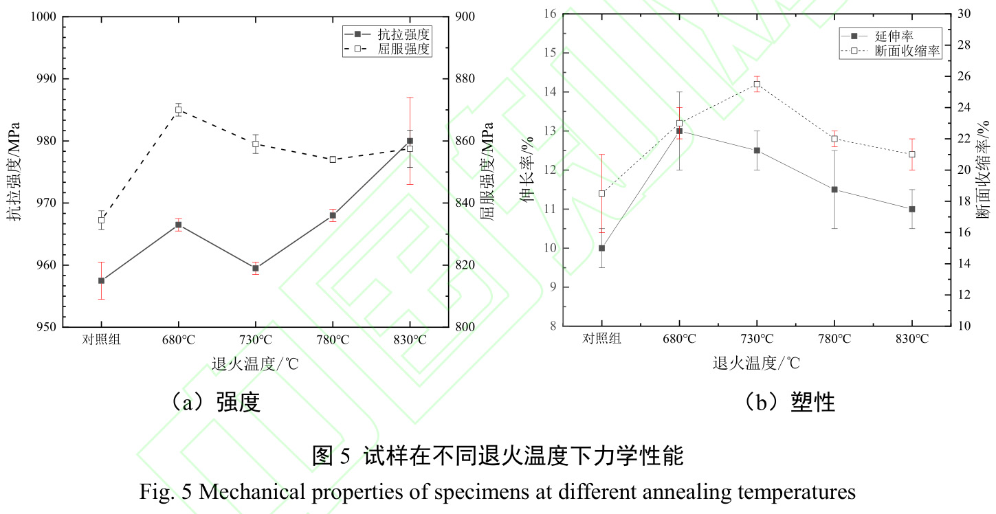 圖5為試樣在不用熱處理溫度下的力學性能。可以看出,與對照組相比,經熱處理后試樣強度和塑性均略有提高,其中抗拉強度最大增幅為24.5MPa,伸長率最大增幅為2.5%,其主要原因在于退火后試樣組織中的板條狀組織細化,長寬比降低,集束條變窄。隨退火溫度增大,合金強度呈先下降后升高,而塑性則先升高后下降,但整體波動幅度較小,主要與組織中α"相的生成,以及β相含量和狀態的變化有關,板條狀β相向等軸狀α"相轉變,同時變得粗大,會導致TC4鈦合金棒加工硬化現象加劇,這主要源于TRIP(Transformation induced plasticity)效應。這些相變也會導致晶粒內部位錯消除,同時晶粒位相關系發生變化,晶界重新排列,最終使得鑄件內部應力集中減少,進而使抗拉強度下降但是屈服強度略有上升,由加工軟化轉向加工硬化。