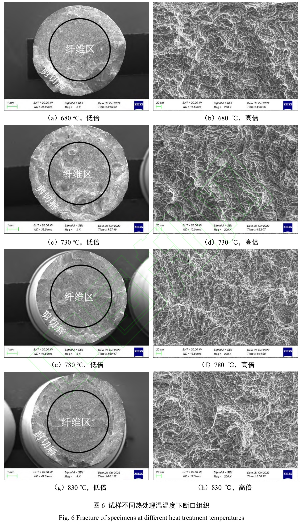 圖6為經不同溫度退火處理后的試樣拉伸斷口形貌。可以發現,各試樣均發生韌性斷裂,主要有纖維區和剪切唇區兩部分組成,可在斷口看到明顯的韌窩結構,但是不同退火溫度下韌窩結構也存在部分差異。在溫度相對較低時,在組織中初生α相發生融合,并未形成常規的α相+板條狀兩相組織,只產生了部分α"相,由于板條狀的兩相組織更窄,因此相較于HIP態強度有大幅提高,且斷口形貌起伏較大。當退火溫度為繼續升高時,α"相轉化程度逐漸升高,合金組織更均勻。經過730℃退火后高氧TC4斷口處韌窩最為明顯,說明在經過730℃退火后合金的韌性最好,這驗證了在經過730℃退火后伸長率和斷面收縮率都較高的現象。而經過780℃退火后的高氧TC4組織斷口起伏相對較為平緩,韌窩結構較小,但是也表現出了明顯的韌性斷裂特征,剪切唇與纖維區區分明顯。