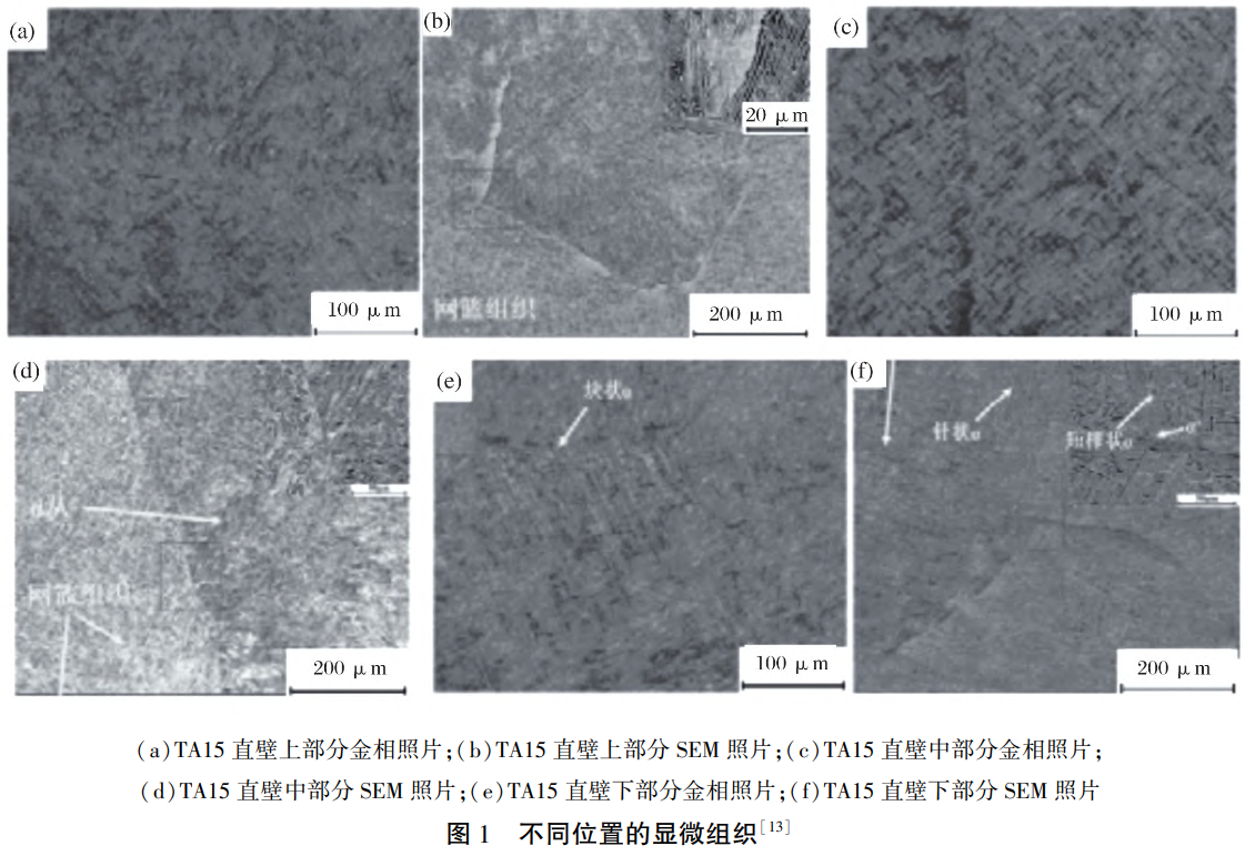 張明朗等[13]研究了增材制造TA15鈦合金直壁構件不同區域的組織特征及拉伸性能。由圖1可 以看出,受熱輸入、熱循環及冷卻速度的影響,構件不同區域組織存在明顯差別,主要有針、片狀α、針 狀馬氏體α′、網籃組織、魏氏組織及大等軸原始β晶。中、下層存在短棒狀α,為初生α。垂 直于焊縫方向與平行于焊縫方向的拉伸性能不同,存在明顯各向異性。