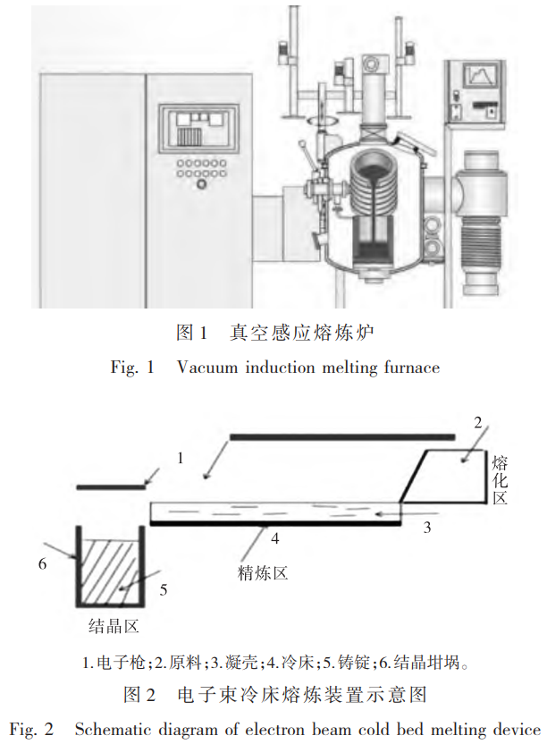 真空熔煉是一種重要的金屬制備方法,其基本原理為將金屬樣品放置于高真空或極低氣壓環境中,通過加熱使金屬熔化后再冷卻凝固,以獲得高純度、低氣體含量的金屬材料[6]。其核心在于利用真空環境,避免金屬與空氣中的氧、氮等雜質發生反應,從而減少雜質的混入。真空熔煉不僅需要高度純凈的工藝環境,還需精確控制溫度、壓力等參數[7],以確保金屬材料的純度和均勻性。