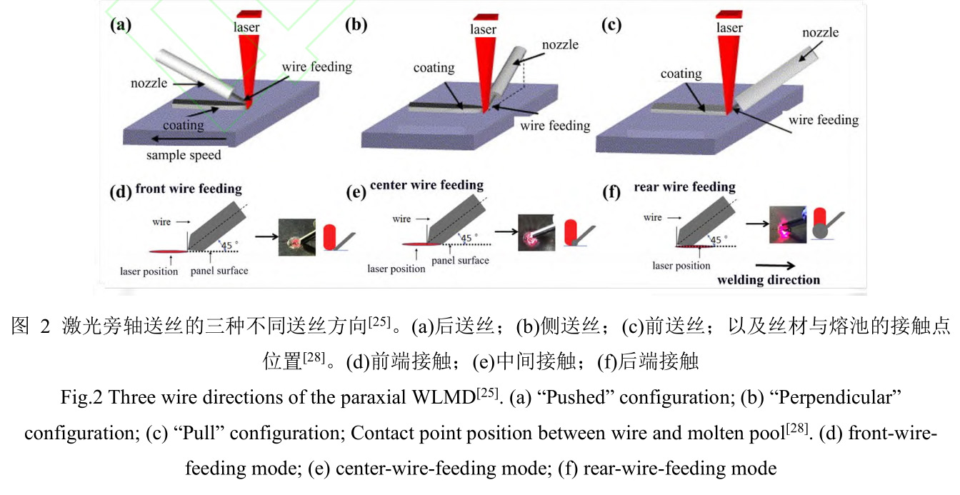 送絲方向對WLMD旁軸送絲成形效果影響顯著,相對于沉積方向會產生前送絲、側送絲和后送絲三種方向,原理如圖2(a)、(b)和(c)所示[25]。前送絲方式是絲材從熔池前方送入熔池進行熔化,熔化后的金屬液進入后方的熔池,后送絲方式與之相反,側送絲方向則介于前送絲與后送絲之間。Kim等[26]認為前送絲方式下,即使送絲速度和位置公差很大,絲材也能完全熔化。同樣地,Syed等[27]的研究也表明前送絲比后送絲對送絲速度和位置具有更好的適應性,在前送絲時絲材被熔池散發的熱量熔化,對熔池的擾動較小并且絲材反射激光較少,因而熔池表面光潔度較好,沉積層內部致密且缺陷較少,而后送絲方式則帶來較多的缺陷。此外,Yang等[28]分析認為在前送絲時絲材不會阻擋激光作用在基板上,基板可以獲得最大的熱輸入,并且熔滴在較高溫度基板上的潤濕度也能提高,從而獲得良好的表面質量。