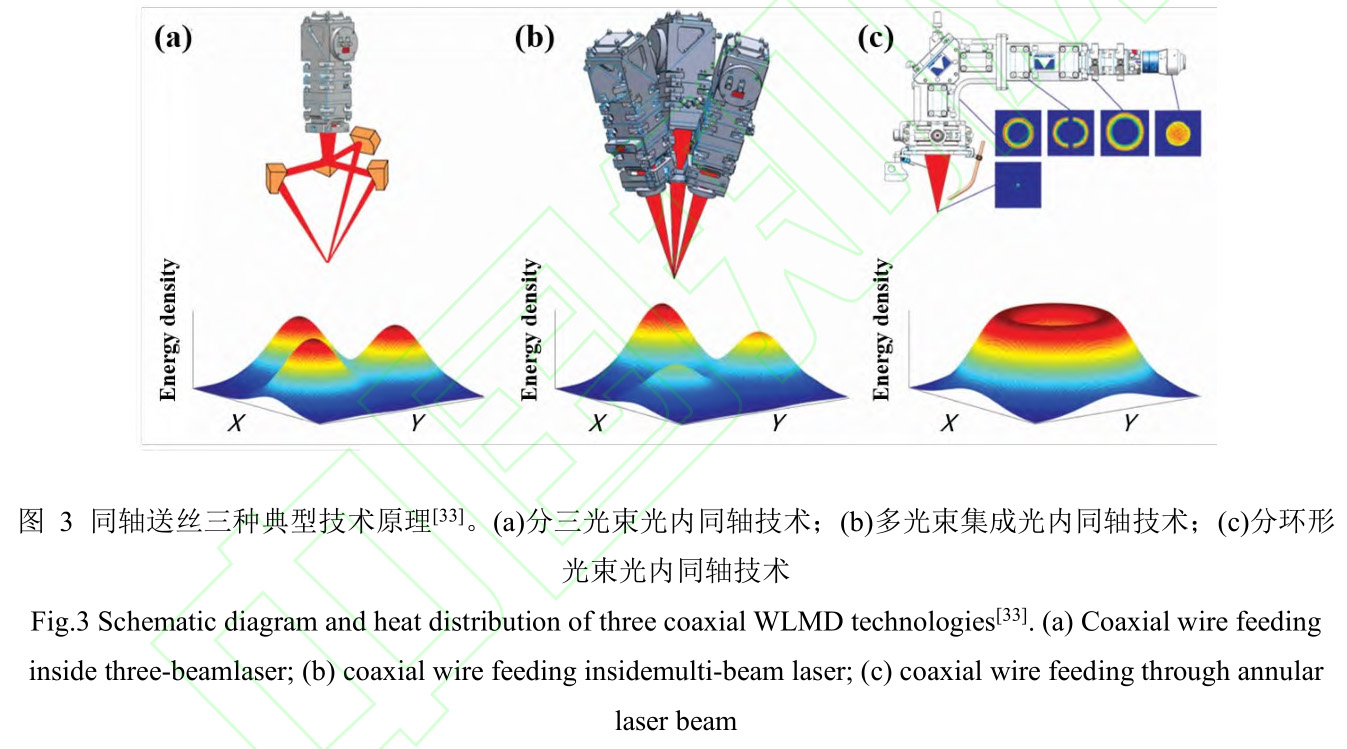 WLMD同軸送絲技術不存在送絲方向的問題,在拐角等方向急劇變化的特殊位置,僅需簡單地通過X和Y軸的加速和減速就能實現過渡,并且不會使得材料過渡堆積,可以極 大地簡化機械結構與電氣控制。目前主流的激光同軸送絲技術可以根據分光的原理分為三種[33],即分三光束光內同軸技術、多光束集成光內同軸技術和分環形光束光內同軸技術,其原理和熱源分布如圖3所示。德國FraunhoferILT研究所先后利用分三光束和分環形光束光內同軸技術制造了WLMD沉積設備,并聯合Precitec公司推出了商用版分環形WLMD同軸送絲沉積設備;而在國內,蘇州大學利用分三光束光內同軸技術原理、重慶綠色智能技術研究所團隊利用多光束集成光內同軸技術原理分別研發了用于實驗室研究的WLMD同軸送絲沉積設備[16,34,35]。