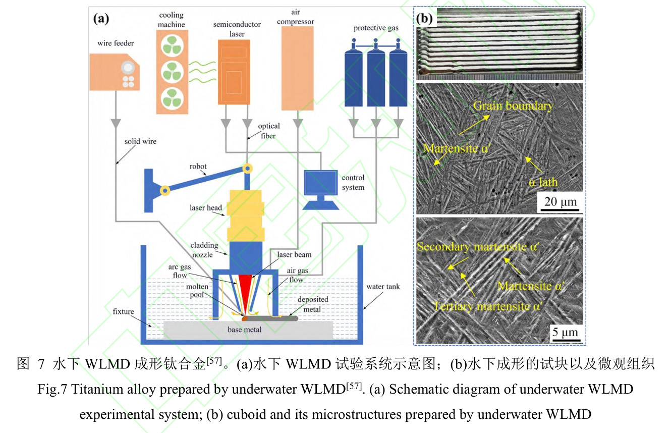 簡言之,WLMD試樣內部通常由粗大的β柱狀晶、晶界α相、晶內片層狀α集束以及少量馬氏體相組成。考慮到魏氏組織和馬氏體力學性能較差,WLMD鈦合金理想的組織為較小尺寸的初生β晶粒,以及盡可能多的α集束和網籃組織[55]。然而,不同的復合工藝和環境會對WLMD組織產生影響。Guo等[56]將電弧和激光增材制造進行復合時,所成形的TC11鈦合金在沉積狀態下微觀組織主要是由層狀α團簇組成的魏氏組織。固溶時效處理后,組織轉變為條形α、β相和細針狀馬氏體相組成的網籃形態,水淬后形成大量的αs次生相和α′馬氏體相,與此同時,α相和β相的尺寸會由于空冷而變粗大。而Guo等[57]采用如圖7所示的水下WLMD技術,通過增加保護氣體流量到80L/min,同時熱輸入從1.75kJ/cm提高到2.5kJ/cm,獲得了均勻無氧化的水下熔覆層;隨著熱輸入量的增加,α板條的晶粒尺寸和厚度增加,α′的含量減少,氧化現象也有所改善,但柱狀β晶粒和球形β晶粒尺寸均增大。不同熱輸入層的顯微組織由不同尺寸的片層α相和針狀α′相組成。此外,冷卻速率的降低抑制了針狀馬氏體的單向生長,使馬氏體的排列接近無序狀態,熔覆層的變形更加均勻,有效地防止了裂紋的擴展。